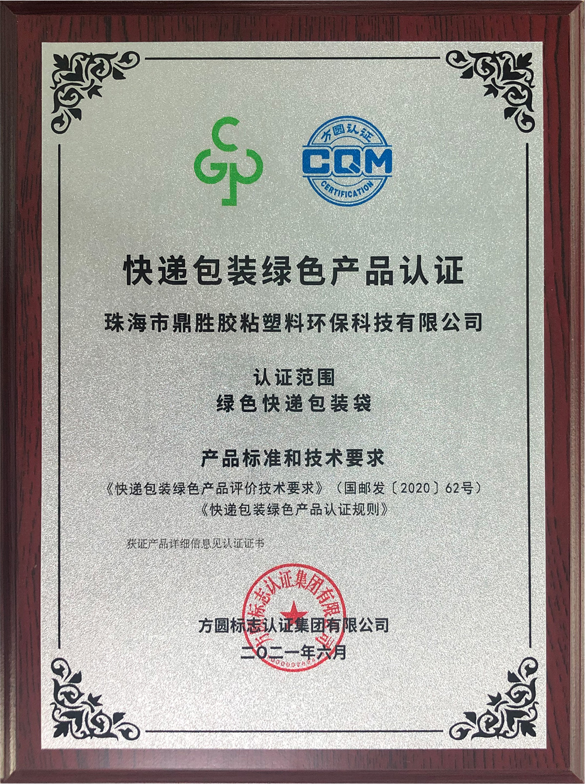 獲國(guó)家郵政總局頒發(fā)的:快遞包裝綠色產(chǎn)品認(rèn)證